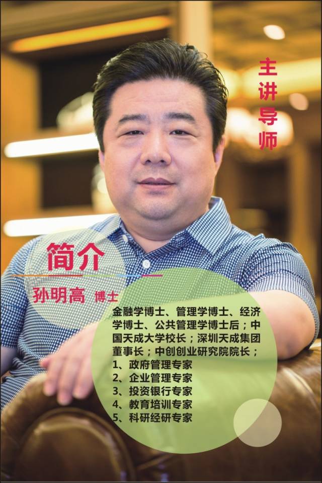 唯一一位具备官、产、学、研实战派资本运营专家,金融学博士,经济学博士,管理学博士后,深圳市乐天成控股集团董事长,天成大学校长。政府管理专家,企业管理专家,投资银行专家,教育培训专家。同时在北京大学、清华大学、天津大学、中山大学、山东财经大学、河海大学、新加坡亚洲管理学院等高等学府,担任客座教授、硕士生导师、博士生导师、研究员等职务。孙明高博士结合当前经济形势与国家经济政策,在供给侧改革和一带一路政策中挖掘企业商业模式创新的机遇,依托大学的多方合作平台,为中小企业解决产能严重过剩,产品销售渠道窄,各类要素成本过高的现状。运用跨境电商、跨境金融、跨境贸易等手段,解决2016年企业生存难题。