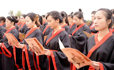 随后,100名专家教师代表和1080名中小学生代表统一身着黑色红边汉服,高声齐诵儒家名篇《论语》。